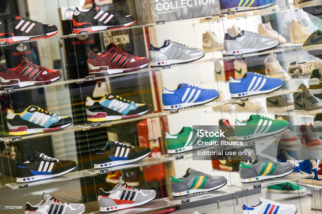 "Milan, Italy - September 14, 2012: Several Adidas shoes in Foot Locker store window in Milan city centre."