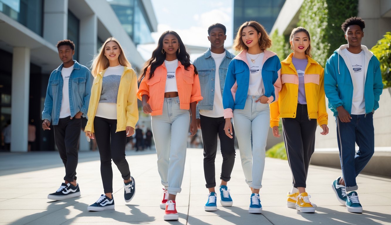 Sekelompok pria dan wanita muda mengenakan sepatu Vans terbaru sedang berdiri dan berjalan di lingkungan perkotaan.
